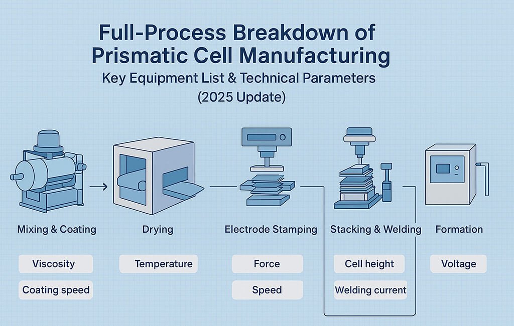 October 14, 2025Published by XHS Battery Machine on October 14, 2025Categories UncategorizedFull-Process Breakdown of Prismatic Cell Manufacturing: Key Equipment List & Technical Parameters (2025 Update)